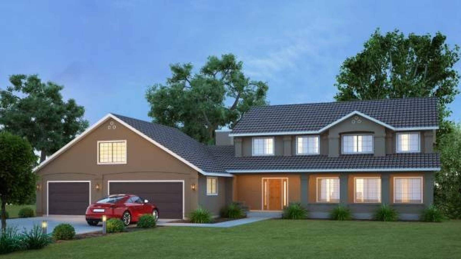The El Dorado panelized kit home shows a Southwestern influence from its covered front porch and unique exterior to the three distinct living areas inside. The foyer opens into a huge living room with access to the formal dining room. Ample counter space and a central island are just two features of the El Dorado’s kitchen, also offering access to both the dining room and a breakfast room or nook. The expansive family room adjoining a storage room, half bath, and three-car garage comprises the second living area. A multi-purpose, oversized laundry and sewing room is accessible from both inside and outside the home. Just a few steps from the family room, stairs lead to the enormous bonus room above the garage, functional as a storage, game, hobby, or media room. The third living area is upstairs, featuring four bedrooms plus a large master bedroom with private bath. The three-car garage has enough room to include either storage or a work area.